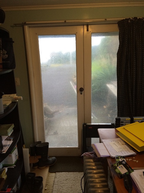 Feel a bit happier, I insulated my office windows with bubble wrap a week ago and put up a curtain over the main glass doors, with the somewhat milder temperatures (only down to 8 degrees at night), I wasn't really seeing any difference between my office (which is an enclosed space underneath the home) and our home, which is wide open, lots of louvers and lots of drafts. However, this morning it was down to 4.8 degrees outside, the house temperatures ranged between 9 degrees and 11 degrees, and my office was up at 13.2 degrees, so a wee bit warmer, having retained a bit more of yesterdays heat. Also, in the home, there is a bit of condensation on various windows (not much - a clouding on some, misting on others - no weeping), but in the office (which has similar humidity levels to the main house - 70%), no condensation forming. See my pic below.